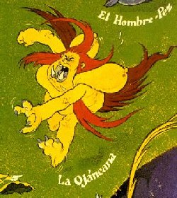 Aquí vive la Juáncana feroz, mezcla de mujer, de osa y de cabra, con un solo ojo, alas muy grandes y pechos enormes que cuelgan hacia atrás.